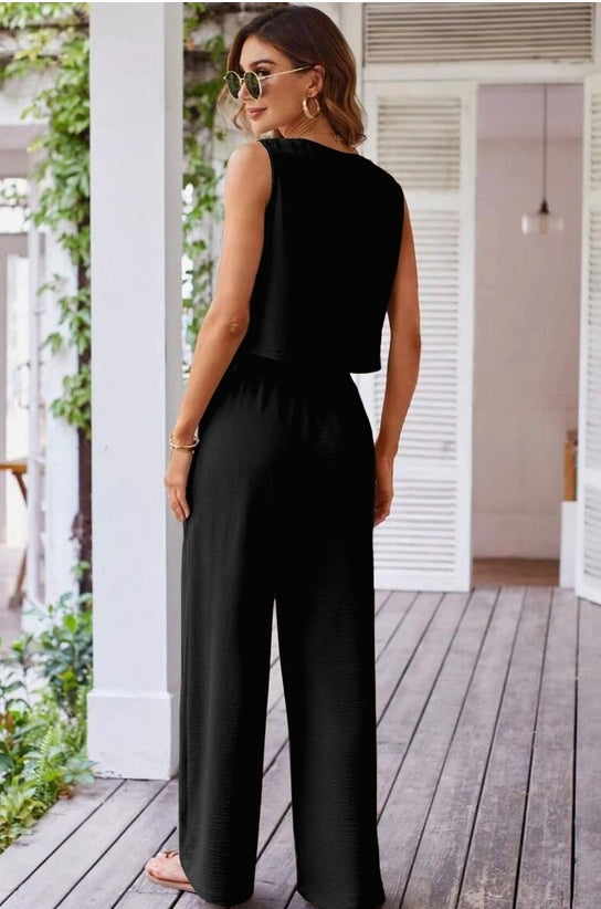 - Stylish buttoned vest and wide leg casual pants coordinate set.